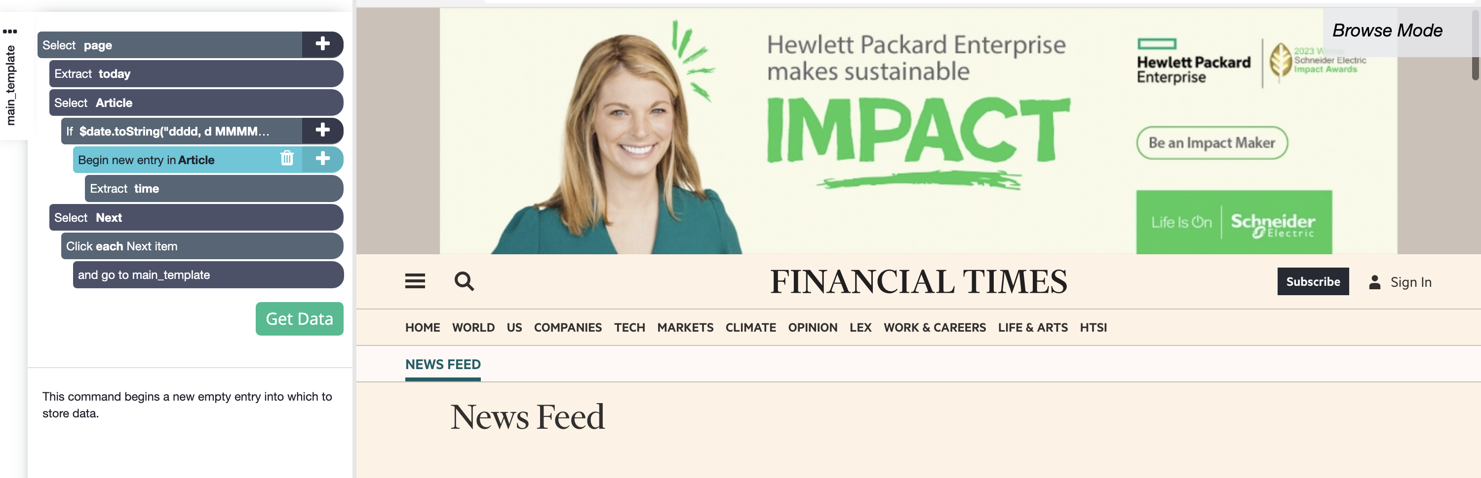 4. Now you can add more details to your entry using Relative Select commands by clicking on the "+" sign next to your "Begin new entry" command and relating your timestamp to other data such as the article headline or preview.