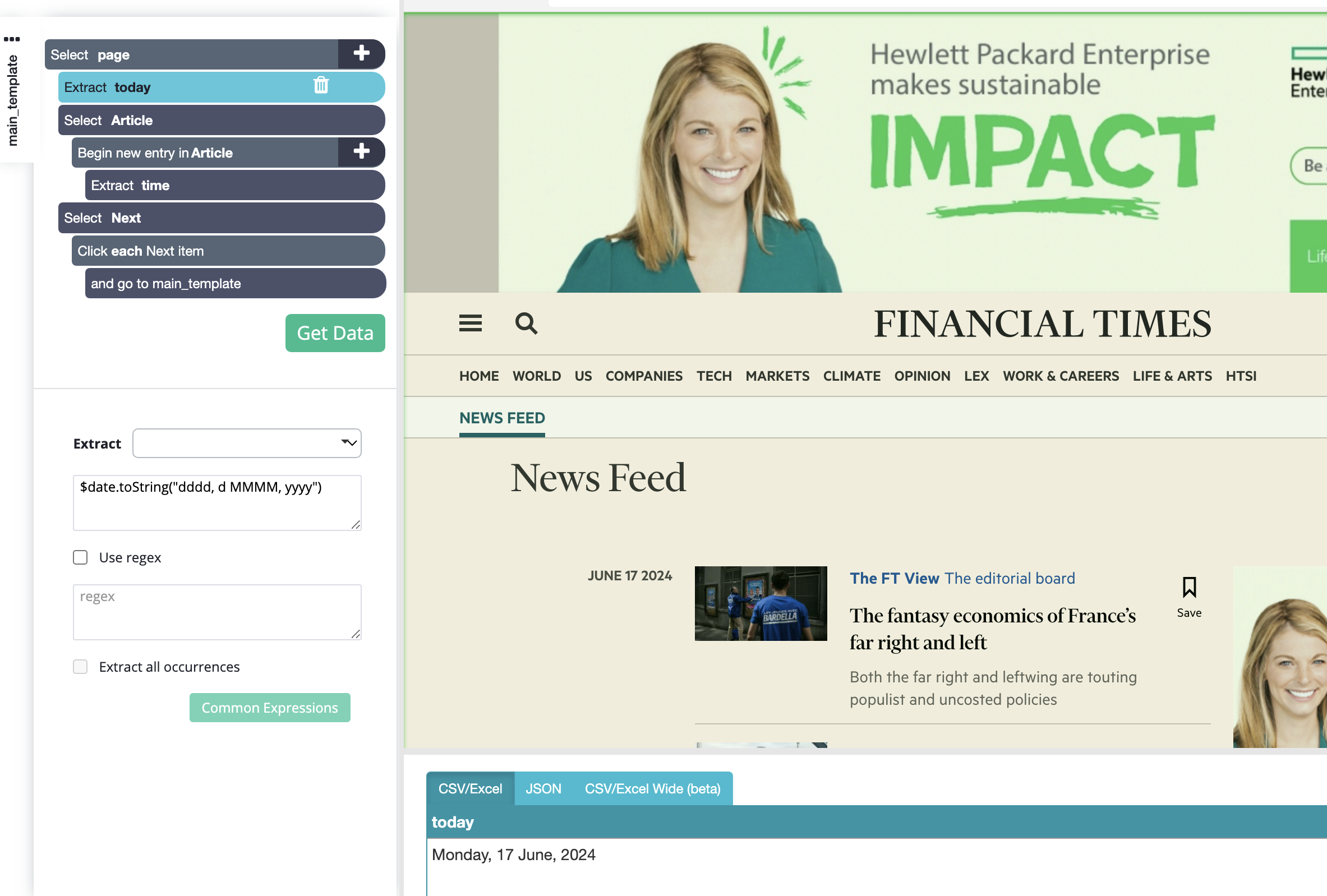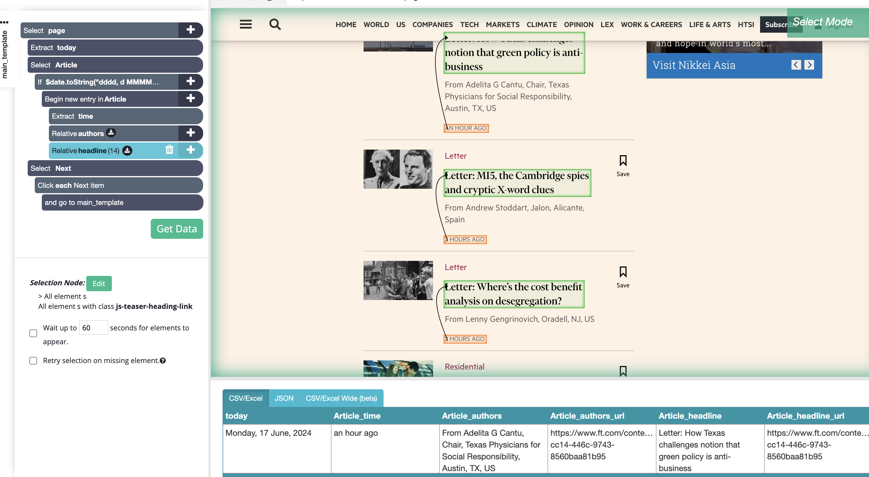 2. Click on the "+" sign next to "Select page", choose a Select command and click on the timestamp for the first article and then on one or two more article timestamps until all of them are selected and highlighted in green. You can rename your selection to "Article" and, where it says "Extract name", change "name" to "time".