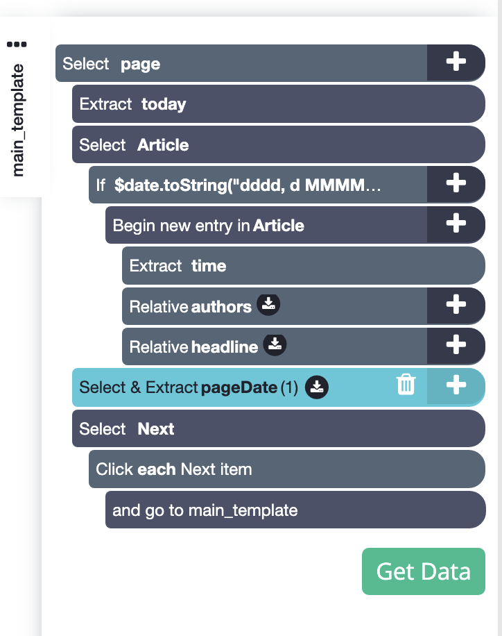 1. Click on the "+" sign next to "Select page" and choose a Select command. Use it to click on the date of the last article on the page. Drag it up to above your "Select next" command and rename selection to "pageDate".
