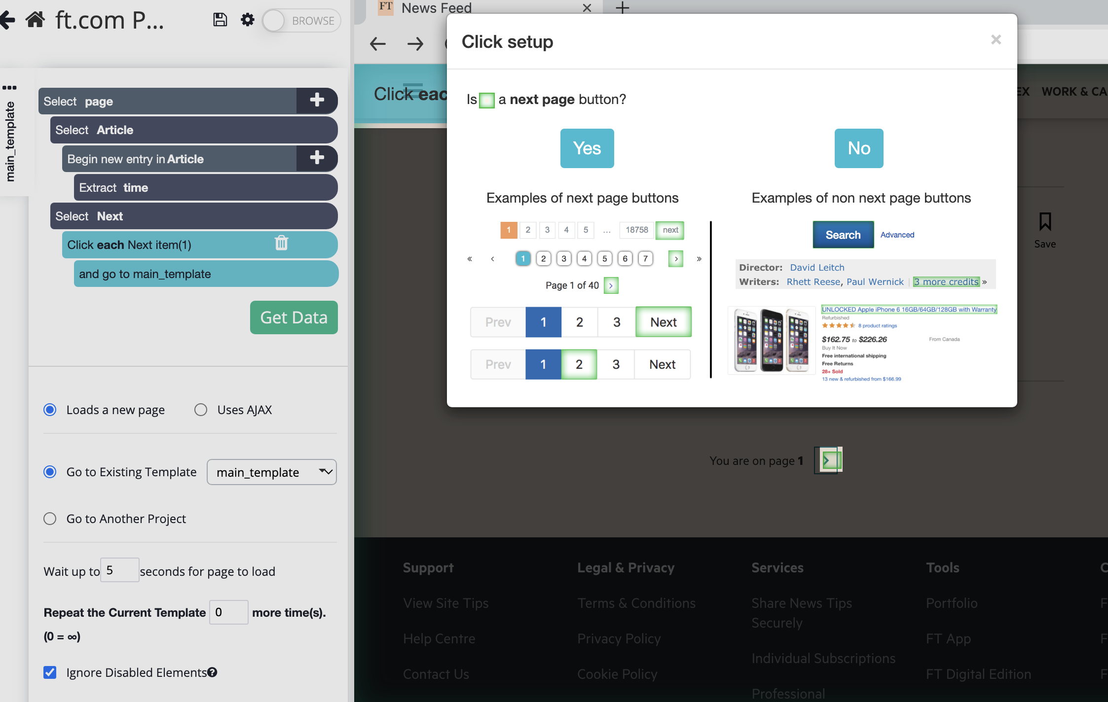 3. To add pagination, click on the "+" sign next to "Select page", choose a Select command and click on the "Next" button. You can rename that selection to "next". Click on the "+" sign next to your "next" selection and choose a Click command. When asked if this is a "next page" button, choose "Yes" which should default to "Repeat the Current Template".