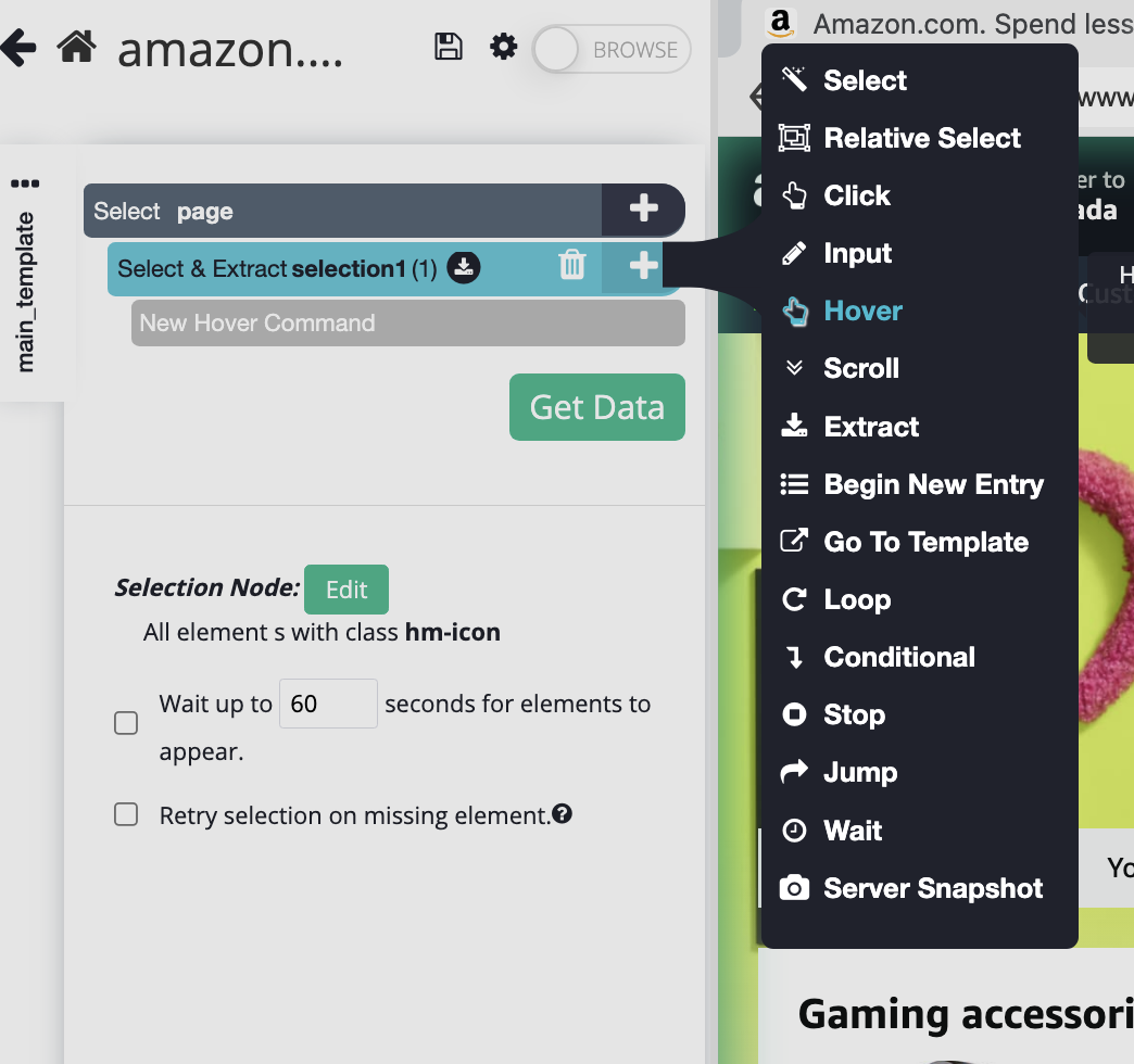 3. Click on the plus button and add a Hover or a Click command, based on how you'd typically display the data that you'd like to scrape from the website.