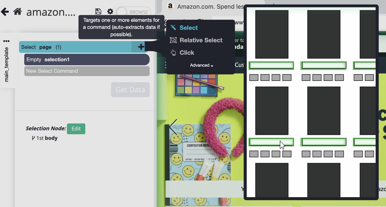 4. ParseHub will show the content displayed after you add the Click or Hover command. Click on the plus button on this command (or the parent command) and add a Select command.