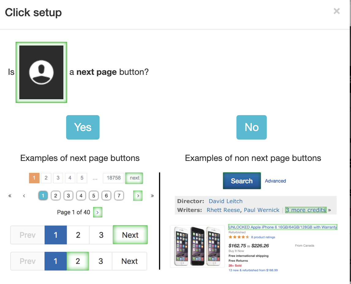 4. In the pop-up that appears, select "No" when asked if this is a "next page" button and make sure to Continue executing the current template. Click on the green button to add the command. This will bring up the log-in pop-up.