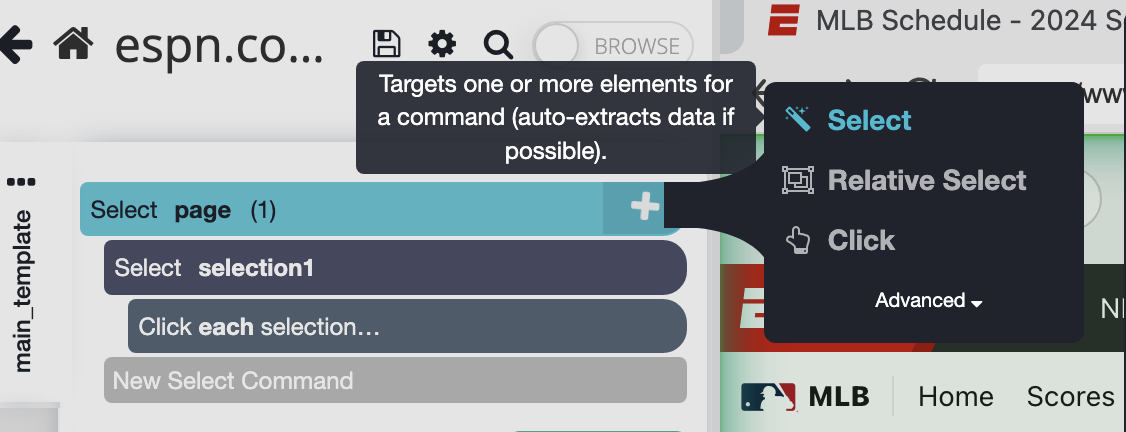 5. Click on the plus button to the right of the Select page command. Add a new Select command.
