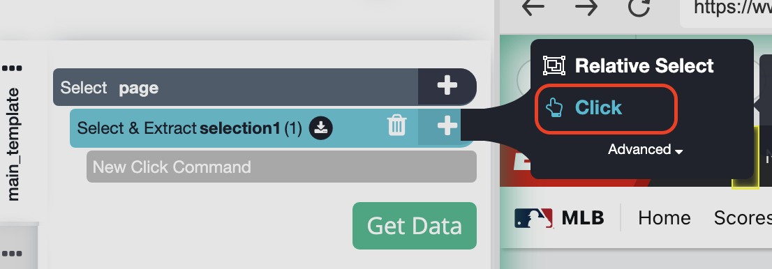 13. Click on the plus button to the right of the Select command and add a Click command.