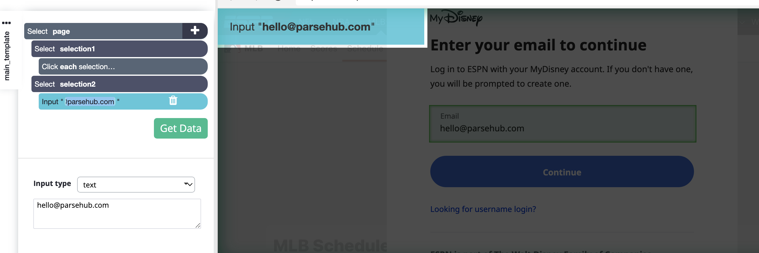 7. A new Input command will automatically appear. ParseHub recognizes when you are selecting a text box and will create this command for you. Type your email address into the Input command.